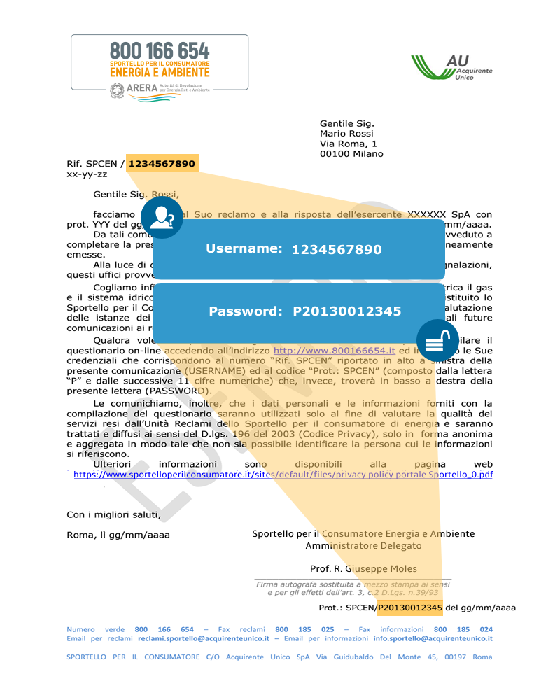 Gentile Signore/a, La informiamo, ai sensi dell’art.13 del Regolamento (UE) 2016/679 (di seguito “GDPR”), che l’Autorità di Regolazione per Energia Reti e Ambiente (di seguito “ARERA”) Le chiede di rispondere al seguente questionario di gradimento dei servizi fruiti tramite lo Sportello per il consumatore Energia e Ambiente, gestito da Acquirente Unico S.p.A. all’uopo nominato responsabile del trattamento. La partecipazione al questionario è facoltativa ed un eventuale rifiuto a partecipare non avrà alcuna conseguenza sulla gestione della Sua pratica o richiesta di informazione. I dati e le informazioni da Lei forniti saranno trattati attraverso strumenti informatici e saranno resi anonimi subito dopo la raccolta e comunque non oltre la registrazione nel rispetto del GDPR. Gli esiti dei questionari saranno diffusi solo in forma anonima ed aggregata, nel rispetto del GDPR, con modalità che non consentano la reidentificazione dei rispondenti e saranno utilizzati al solo fine di valutare e migliorare la qualità dei servizi resi dallo Sportello per il consumatore Energia e Ambiente. In qualunque momento, ai sensi dell’art. 15-22 del GDPR, può conoscere le informazioni che La riguardano, verificare se sono esatte, integrarle, aggiornarle, rettificarle, opporsi al loro trattamento per motivi legittimi ed esercitare gli altri diritti riguardanti i suoi dati personali, rivolgendosi allo Sportello per il consumatore Energia e Ambiente https://www.sportelloperilconsumatore.it/lo-sportello/contatti Per maggiori informazioni in materia di protezione dei dati personali, La invitiamo a consultare l’informativa completa disponibile sul sito di ARERA https://www.arera.it/privacy-policy/sportello-consumatore